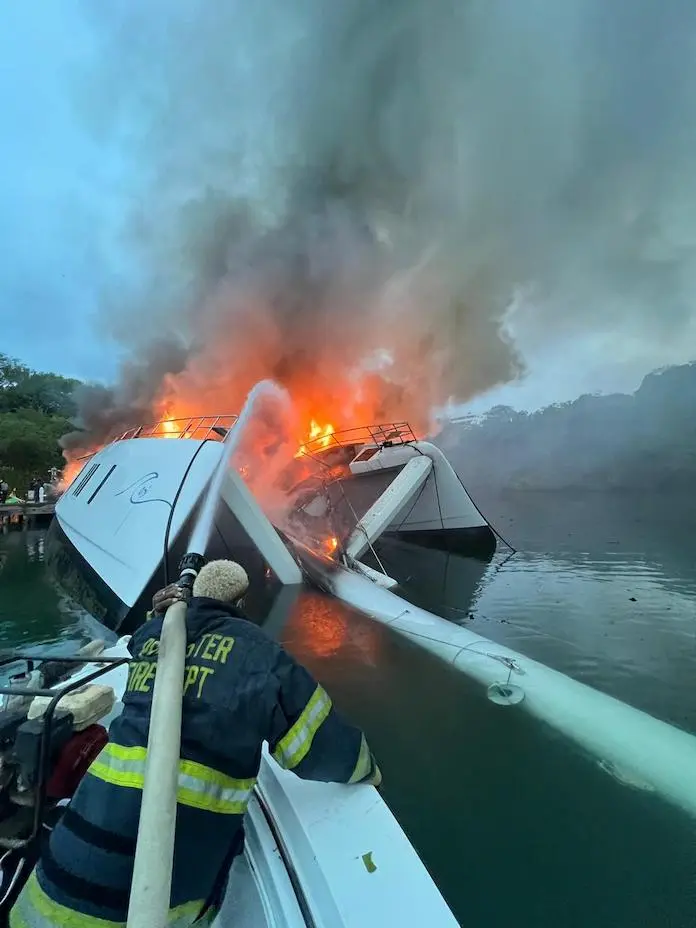 El fuego consume la embarcación de Fernando Capellán mientras bomberos enfrentan enormes dificultades para controlar las llamas desde la costa